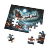 Au fur et à mesure que vous reconstituez ce voyage nocturne, chaque fragment de puzzle révèle davantage l'esprit festif, des cottages confortables et lumineux nichés parmi les pins aux routes sinueuses tranquilles saupoudrées de neige fraîche. Les villageois, minuscules dans le grand champ de la nuit, ajoutent vie et mouvement au tableau serein.
