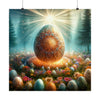 L'affiche invite le spectateur à participer à la tranquillité et au respect du matin de Pâques, avec les rayons du soleil accordant une douce grâce à la surface ornée de l'œuf. Ce n'est pas seulement une image ; c'est une expérience qui résume la beauté profonde des nouveaux départs associés à la saison.