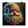 Avec une barbe qui tombe en cascade comme une tapisserie de motifs vibrants et complexes et un chapeau qui s'enroule vers le ciel, saupoudré de flocons de neige frais, ce gnome est le gardien de la joie et de la joie de l'hiver. Ses yeux scintillent avec les joyeux secrets de la saison, et son nez rond et rose est une touche de chaleur sur les teintes bleues et fraîches du fond de forêt enchantée.