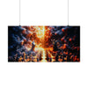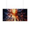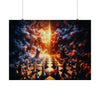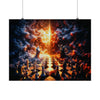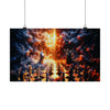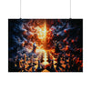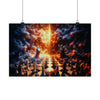 "The Eternal Game" est une affiche visuellement saisissante qui capture une scène fantastique et éthérée se déroulant sur un grand échiquier. Le tableau lui-même est éclairé par une source de lumière rayonnante, créant un contraste saisissant entre la chaleur de la lumière et la fraîcheur des ombres. Chaque pièce d'échecs est minutieusement détaillée, suggérant une signification au-delà de leurs rôles habituels liés au jeu. Dominant la scène se trouvent deux personnages majestueux, vêtus et posés comme s'ils étaient enfermés dans une lutte ou une négociation intemporelle, incarnant la profondeur stratégique et philosophique des échecs. Les personnages sont placés sur un fond qui brouille la frontière entre céleste et infernal, avec des nuages tourbillonnants et des formes nébuleuses qui évoquent un sentiment de conflit cosmique. La qualité éthérée de la scène suggère que le jeu auquel ils jouent est un jeu aux conséquences profondes, une métaphore des dualités de l’existence elle-même : la lumière et l’obscurité, l’ordre et le chaos, le bien et le mal. Cette affiche invite à la contemplation et à l’émerveillement, alors que les spectateurs sont attirés dans les profondeurs de son tableau surnaturel.