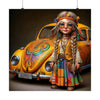 Derrière Luna, son destrier psychédélique, une Volkswagen Beetle jaune classique, se trouve une toile de couleurs tourbillonnantes et de motifs vibrants, faisant écho au mouvement emblématique du flower power. Sa présence est un clin d’œil nostalgique à l’époque où les véhicules étaient plus que de simples machines ; ils étaient des compagnons sur le chemin de la découverte.