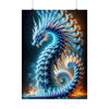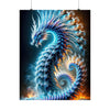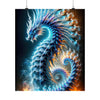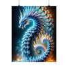 Des teintes vives de bleu glacé et de blanc éclatant se heurtent à des oranges et des rouges flamboyants, évoquant la danse élémentaire du feu et de la glace qui joue sur la silhouette serpentine du dragon. Ses yeux, profonds bassins d’émerveillement cosmique, semblent contenir les mystères tourbillonnants de galaxies lointaines, invitant le spectateur à réfléchir aux profondes énigmes de l’existence. La brume environnante, chef-d'œuvre fractal, s'enroule autour du dragon dans une étreinte éternelle, suggérant une forme à la fois présente et éthérée.