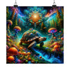 L'affiche « Le rêve de la tortue : un univers sous la coquille » est une porte d'entrée vers un voyage surnaturel, invitant le spectateur dans un paysage onirique où convergent le mystique et le naturel. Cette pièce visuellement époustouflante capture l'essence d'un voyage cosmique, encadré par la présence tranquille d'une tortue mystique dont la carapace abrite un univers regorgeant de couleurs vibrantes, de motifs célestes et de lumière éthérée. La toile de fond est une forêt enchanteresse, éclairée par la lueur naturelle de champignons magiques, créant une scène à la fois sereine et pleine d’émerveillement.