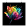 Préparez-vous à être fasciné par la représentation hyperréaliste d'une tulipe arc-en-ciel dans cette image époustouflante. Chaque pétale est méticuleusement détaillé, avec des couleurs vives qui semblent jaillir du fond noir. Les pétales semblent être en mouvement, comme s'ils coulaient et éclaboussaient, créant un effet visuel dynamique qui ajoute une sensation d'énergie et d'excitation à la composition.