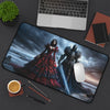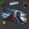 Le sous-main, fabriqué à partir d'un tissu durable et lisse, fournit une vaste toile pour l'image fascinante où l'élégance de la dame vêtue de pourpre se mêle à la présence formidable de son homologue en armure d'obsidienne. Les tons riches et sombres du passe-partout améliorent non seulement l'impact visuel de l'œuvre d'art, mais confèrent également une touche de sophistication à votre bureau.