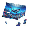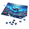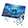 Autour du Léviathan se trouve un récif de corail luxuriant et vibrant, regorgeant de vie, rendu dans une gamme de couleurs rayonnantes et de formes éthérées. L'assemblage de cette partie du puzzle sera comme orchestrer une symphonie des teintes les plus splendides de l'océan : des bleus électriques, des roses vifs et un spectre de couleurs qui suggèrent un monde d'émerveillement caché juste sous la surface de l'eau. La lumière qui filtre à travers la douce houle de l'eau ajoute une texture dynamique au puzzle, défiant la perception alors qu'elle scintille à travers le tableau.