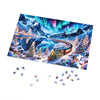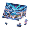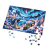 Ce puzzle, « Winter Wonderland Express », capture une scène à couper le souffle d'un voyage en train festif. Le puzzle représenterait une locomotive à vapeur verte classique ornée d'une couronne vibrante, son phare perçant le crépuscule, traversant un paysage enneigé immaculé. Le train serpente le long des voies qui longent le bord d’un lac cristallin, reflétant la scène comme du verre. De chaque côté du lac, de confortables chalets de montagne scintillent de lumière dorée au milieu des pins chargés de neige. La scène est couronnée par une aurore boréale éblouissante, avec des rubans roses, verts et violets dansant dans le ciel nocturne, se reflétant sur les eaux sereines en contrebas. Les éléments du premier plan comprennent des sapins recouverts de neige et ornés de lumières de Noël colorées, et la scène est encadrée par de grandioses montagnes glacées s'élevant dans le ciel. Ce puzzle promet d'offrir non seulement un festin visuel avec ses couleurs et reflets vibrants, mais aussi un défi satisfaisant pour les longues et agréables nuits de la période des fêtes. Une fois terminé, il constituerait une superbe pièce d’exposition pour célébrer l’hiver et ses festivités.