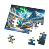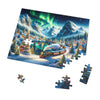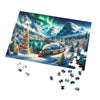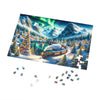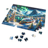 L'image du puzzle représente un train à vapeur vintage circulant le long d'un paysage enneigé, émettant des panaches de fumée blanche alors qu'il fait le tour d'un lac serein et gelé. Un décor de montagnes majestueuses aux sommets enneigés sous un ciel étoilé est illuminé par la lueur éthérée des aurores boréales dans des tons chatoyants de vert et de bleu. Le confortable village de montagne est illuminé par les lumières chaudes provenant des fenêtres de charmantes cabanes en bois nichées parmi les conifères. Un sapin de Noël central joliment décoré constitue le point culminant de la fête, orné de lumières colorées qui font écho à l'esprit joyeux de la saison. Cette scène pittoresque, capturée dans un style pictural avec des couleurs riches et vibrantes et des détails complexes, offrirait une expérience de puzzle joyeuse et stimulante, parfaite pour les longues soirées d'hiver. Le puzzle terminé serait non seulement une délicieuse activité de vacances, mais aussi une superbe œuvre d'art à exposer.