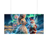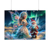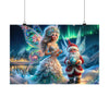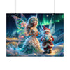 "A Fairytale Christmas" features an enchanting winter scene illuminated by the ethereal glow of the Northern Lights. The majestic backdrop showcases snow-capped mountains reflecting on a tranquil, icy lake. At the heart of this magical landscape, a resplendent ice fairy in a sparkling white gown, adorned with intricate frost-like patterns and iridescent wings that shimmer with a spectrum of vibrant colors, offers a delicate snowflake to the world. Beside her, a jovial Santa Claus, with twinkling blue eyes and rosy cheeks, dons a traditional red and white suit with a twist of fantasy. His gossamer wings glisten like delicate frost as he holds a glimmering blue ornament. Together, they embody the spirit of Christmas, bringing a fairytale touch to the holiday season.