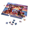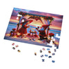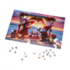 Each puzzle piece is a part of their love story, from the shimmering red dress worn by Elara, reflecting the sunset's glow, to the heartfelt gesture of Finn, on bended knee with a ring sparkling with promise. As you fit each piece, watch the scene come to life with the intricate details of the beach setting: the delicate draping of the cozy nook, the blush of red roses, and the intimate glow of candlelight, all under a canopy of a twilight sky transitioning from day to night.