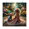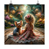 The poster showcases the girl, attired in a gown adorned with the finest of the garden's offerings, and her Yorkie, a creature as noble as he is small, both absorbed in the quiet splendor of their surroundings. The air around them is alive with swirls of enchanting colors that seem to emerge from the flora itself, suggesting a place where the marvels of nature and the warmth of companionship intertwine.