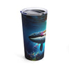 The intricate art is printed in high definition, ensuring that each swirl and hue stands out against the sleek stainless steel background. Above the whale, rays of light break through the water's surface, creating a serene yet dynamic backdrop that brings the image to life. This tumbler is not only a functional drinkware item but also a portable piece of art that invites conversation and admiration.