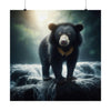 The image presents a striking portrait of a sun bear standing on a rock, gazing directly at the viewer. The bear's black fur contrasts with its distinctive orange-tan chest crescent, and its curious eyes reflect a sense of intelligence and awareness. Dew or mist clings to its fur, suggesting the humidity of its natural rainforest habitat, and the air around it sparkles with moisture, hinting at either a recent rainfall or a waterfall nearby. Behind the bear, a soft glow filters through the trees, possibly the sun breaking through the canopy, adding a majestic backlight to the bear's silhouette. The overall atmosphere of the photo is one of wild, natural beauty and a serene moment captured in the bear's day.