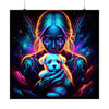 The "Cosmic Bond" poster is a stunning visual odyssey that captures the enchanting connection between the cosmos and the purest forms of life. At the heart of the design is Aria, the Celestial Guardian, whose ethereal beauty is rendered in a radiant spectrum of neon hues that symbolize her essence as a caretaker of the universe's harmony. Her eyes are closed in a serene expression, suggesting a deep sense of peace and contemplation.