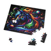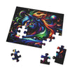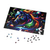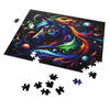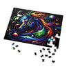 This vibrant jigsaw puzzle, titled "Cosmic Cascade," would be a challenging and enchanting addition to any puzzle enthusiast's collection. The central figure is a majestic horse's head, illustrated in a swirling spectrum of neon colors that blend seamlessly into one another against a deep, starry space backdrop. Each strand of the horse's flowing mane is tinged with a rainbow hue, giving the impression of a cosmic river of light. Bright celestial bodies, from full moons to distant stars, dot the scene, adding to the otherworldly charm. The puzzle's complex interplay of colors and cosmic elements makes it a visually stimulating piece that promises hours of engaging activity.