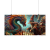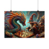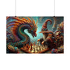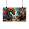 This breathtaking image captures a surreal and vibrant showdown between a mystical dragon and an enigmatic wizard, engrossed in an epic game of chess. The dragon, with its scales shimmering in a kaleidoscope of colors, exudes an aura of ancient wisdom and power. Opposite, the wizard, draped in a cloak of intricate patterns that mimic the swirling cosmos, contemplates his next move with a calm, collected spirit. The chessboard itself is a masterpiece, carved with the finesse of otherworldly craftsmanship, each piece a work of art representing the dual forces of magic and might. This scene, set against a backdrop of fractal beauty that seems to stretch into an infinite vortex, symbolizes the grandeur of strategic battle where every move resonates with the echoes of timeless legends.