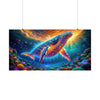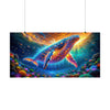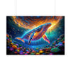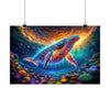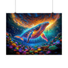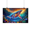 The "Cosmic Dance of the Humpback Whale" poster is a transcendent piece of interior décor, a vibrant testament to the majesty of both oceanic depths and astral heights. As a centerpiece, it arrests the eye with its luminous colors, the humpback whale, Azura, portrayed in mid-dance amidst the swirling nebulas and cosmic currents.