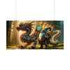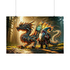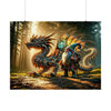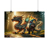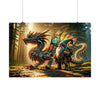 Imagine this scene unfurling before you in a grand poster, perfect for adding a touch of whimsy to any room. "Curiosities and Scales: A Gnome's Tale" would be rendered in exquisite detail, inviting the viewer to step into a world where magic pulses through the forest and companionship knows no bounds. The rich colors and intricate patterns of the dragon's scales would catch the eye from across the room, while the gnome's expression of wonder and delight would draw one closer, begging to be examined up close. This poster isn't merely a piece of art; it's a portal to a place where the mystical bond between a gnome and his dragon companion whispers of adventures and secrets waiting in the verdant depths of the enchanted woods.