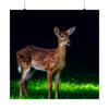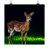 The photo captures a serene fawn bathed in a soft glow that highlights its youthful innocence and delicate features. Its coat is dappled with white spots, a charming characteristic of its youth, which stands out against the shadowy backdrop of a dense forest or darkened field. The fawn's eyes are gentle and alert, reflecting a sense of curiosity about its surroundings. A soft beam of light filters through the foliage, illuminating the lush green grass at its feet and casting a warm, ethereal aura around the creature. This tranquil moment encapsulates the quiet beauty of nature and the gentle grace of wildlife.