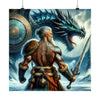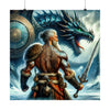 This poster depicts a scene brimming with epic fantasy elements. At the forefront stands a robust warrior with a seasoned, dignified bearing. His hair and full beard are a striking silver, suggesting a wealth of experience and battle-won wisdom. He is adorned with intricate tattoos that spiral across his muscular arms and broad chest, speaking to a rich cultural heritage or perhaps personal victories and statuses. Over his shoulder, we see the glint of a formidable dragon companion, its scales a deep, oceanic blue that reflects the light, showcasing its formidable presence. The dragon's eyes glow a vivid green, and its fierce expression is aligned with the warrior's stoic demeanor.