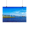 This vibrant photograph is taken from the Duluth, Minnesota Harbor, showcasing a picturesque waterfront scene. In the foreground, a row of uniform, gabled-roofed townhouses stands neatly along the water's edge, their light exterior walls and symmetric design giving off a quaint and orderly suburban feel. Each home boasts a view of the harbor, suggesting a blend of residential tranquility and scenic waterfront living.
