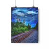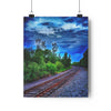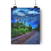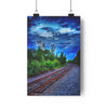 This photo captures the essence of a train track in Duluth, Minnesota, known for paralleling the scenic trail along Lake Superior. The track itself bends gracefully out of view, inviting thoughts of travel and the distant places it may lead. Rusty and weathered, the rails and wooden ties tell stories of frequent use and the passage of time. To the left, lush greenery flanks the railway, with trees in various shades of green suggesting the diversity of the local flora. Above, the sky is a dramatic display of blue and gray, with clouds that seem to echo the railroad's journey towards the horizon. This dynamic sky suggests an impending change in weather, adding a sense of drama and anticipation to the scene. Overall, the image conveys a blend of human engineering and natural beauty, characteristic of this region's landscapes.