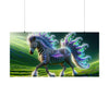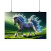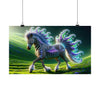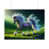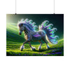 Behold the breathtaking spectacle of "Effulgent Blaze," where the wild untamed beauty of the natural world converges with a touch of fantasy. This magnificent poster captures the majestic grace of a mythical zebra, its stripes pulsating with a life of their own, shimmering in hues of hypnotic blues and purples that dance and intertwine like the roots of ancient trees. The creature's mane and tail are a marvel to behold, a fluid cascade of luminous white hair that transforms into a fantastical array of spiraling tendrils, each one alive with iridescent colors that echo the vibrancy of the deepest oceans and the tranquility of the night sky.