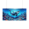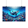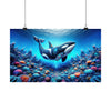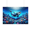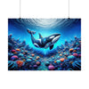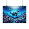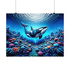 The water above is a mirror to the sky, rippled by the gentle motion of the sea, reflecting the light and creating an illusion of endless space. The leviathan, surrounded by a halo of light filtering through the water, appears both as part of this underwater realm and a visitor from another world. This poster is not just a depiction of marine life but an invitation to imagine and explore an ethereal domain, a tribute to the mythic beauty that lies beneath the waves, in the silent depths where nature's grandeur plays out unseen.
