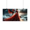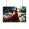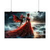 Unveil the majesty of "Empress of the Storm: A Dance with the Dragon" in this evocative poster. The artwork features a formidable woman, the Empress herself, arrayed in a flowing red gown that cascades into the tumultuous ocean beneath her. She stands resolute against a backdrop of an impending tempest, with thunderous clouds roiling above. By her side, a regal red dragon, Vermithrax, stands guard, its wings unfurled, ready to soar or to fight. This poster captures a moment of unity between the elements and the ethereal, with a palette that emphasizes the stark contrast between the dark storm and the fiery hues of the companions. Ideal for admirers of fantasy and myth, this poster is a gateway to a world of adventure and power, where the boundary between sea and sky is a stage for legends.
