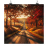 This photograph captures the serene beauty of Missouri's gravel back roads, set amidst a picturesque autumn tapestry illuminated by the afternoon light. As you peer through the dancing sunlight, the eternal winding road, lined with vibrant foliage, begins to unravel before you.