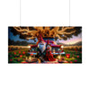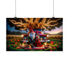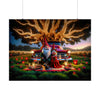 Step into the enchanting world of "Enchanted Twilight Picnic," a poster that captures the essence of romance and whimsy. At first glance, be swept away into a lush, mystical grove under the canopy of an ancient wisdom tree, its branches alive with a mesmerizing dance of fireflies. The scene is set at dusk, where the sky is painted with the last strokes of the sun's retreat, giving way to the mysteries of twilight.