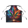The apron design would feature a striking and vibrant image of a cannabis leaf. The leaf itself would be at the center, emanating an illusion of a glowing light from its base, causing an array of colors to reflect on the contours of each leaflet. Surrounding the leaf would be a dynamic and colorful display of smoke, with hues of fiery red, electric blue, and neon green that appear to dance around the leaf in a mesmerizing fashion. The background would be dark, emphasizing the vivid colors and giving the impression that the leaf is almost floating in space. The smoky effect gives a sense of motion, as if the colors are smoldering and swirling in the air, adding a touch of surreal and artistic flair to the apron. This bold design would be printed on high-quality poly twill fabric, ensuring that the colors remain vibrant and the apron durable for kitchen use.
