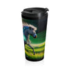 The travel mug features the enchanting image of the "Fluorescent Astra," a zebra that transcends the ordinary with its radiant, neon-like stripes and a mane that flows with the colors of a distant nebula. The artwork wraps elegantly around the mug, allowing you to admire the stunning visual from every angle. The zebra stands amidst a vibrant, surreal landscape, with its mane and tail aglow with an array of hypnotic colors that seem to pulse with life.