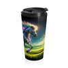 "Fluorescent Mystique" Stainless Steel Travel Mug, 15oz – Embark on your daily journeys with the extraordinary "Fluorescent Mystique" travel mug, a fusion of art and functionality. This 15-ounce travel companion features the captivating design of a fluorescent zebra, its vibrant stripes a dynamic array of luminous colors that seem to dance with life against a soft, green landscape bathed in the last light of day. Crafted from robust stainless steel, this travel mug is built for the rigors of everyday use, keeping your favorite drinks securely contained and at the perfect temperature, whether hot or cold. The contour of the mug is designed for comfortable holding, making it a pleasure to grasp as you sip and savor the essence of a mystical realm. Complete with a snug-fitting lid to prevent spills, this travel mug is not just a container but a statement – a slice of fantasy to take with you, no matter where your path leads.