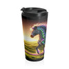 Sip in style with the enchanting "Fluorescent Shimmer" Stainless Steel Travel Mug, a 15 oz vessel that marries elegance with utility for the dreamer on the move. This travel mug showcases a dazzling image of a mythical horse-like creature, whose radiant, neon-bright stripes and flowing mane captivate and glow against the peaceful backdrop of a dusk-lit landscape.
