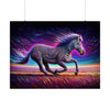 This vibrant poster, titled "Fluorescent Spectrum," showcases a surreal depiction of a zebra. The animal is illustrated with a dazzling array of fluorescent colors, emphasizing purples, blues, and pinks that flow seamlessly into each other, creating a vivid, dreamlike effect. The zebra's stripes are transformed into intricate patterns that swirl and twist, giving the impression of a living, breathing tapestry of light. Its mane and tail are exaggerated into flowing ribbons that echo the psychedelic colors and patterns of its body, adding to the sense of motion and energy.