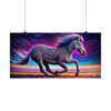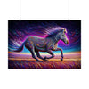 The background is a hypnotic landscape, with sweeping lines of color that suggest a rapidly moving ground under a twilight sky, further enhancing the magical and otherworldly feel of the image. This poster would make a stunning and captivating addition to any space, inviting viewers to step into a fantastical world where nature's beauty is amplified to extraordinary levels.