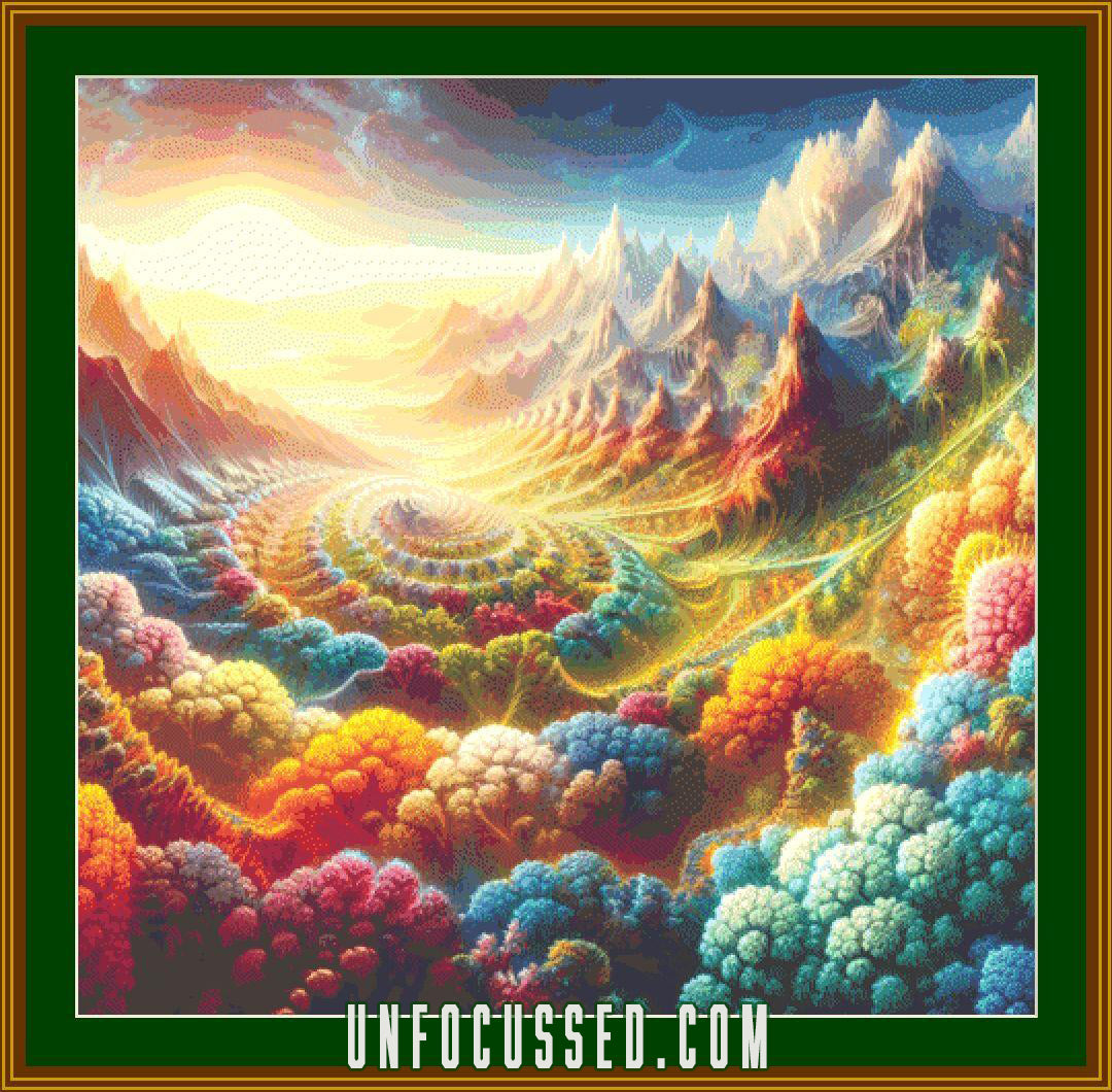 The "Fractal Dreamland" cross-stitch pattern offers an enchanting journey into a kaleidoscope of colors and shapes. Designed by Kiwi Flying Stitch Design, this pattern is a nod to the intricate artwork of Bill and Linda Tiepelman. Sized at a substantial 465 W x 455 H stitches, it translates to about 18.60” x 18.20” when stitched on 25ct fabric. This project, calling for 150 DMC colors, is perfect for the experienced stitcher looking to immerse themselves in a complex and rewarding endeavor that promises a stunning display upon completion.