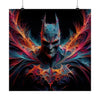 Shards of neon colors explode from the silhouette, a vibrant contrast to the darkness that envelops the phantom's form. The intricate patterns swirl around the entity like a celestial storm, suggesting a presence that is both protector and harbinger. Its bat-like aura, composed of a fiery spectrum ranging from the deepest crimsons to the brightest oranges, hints at a familiar symbol of nocturnal heroism, yet reinvented into a being that transcends time and space.