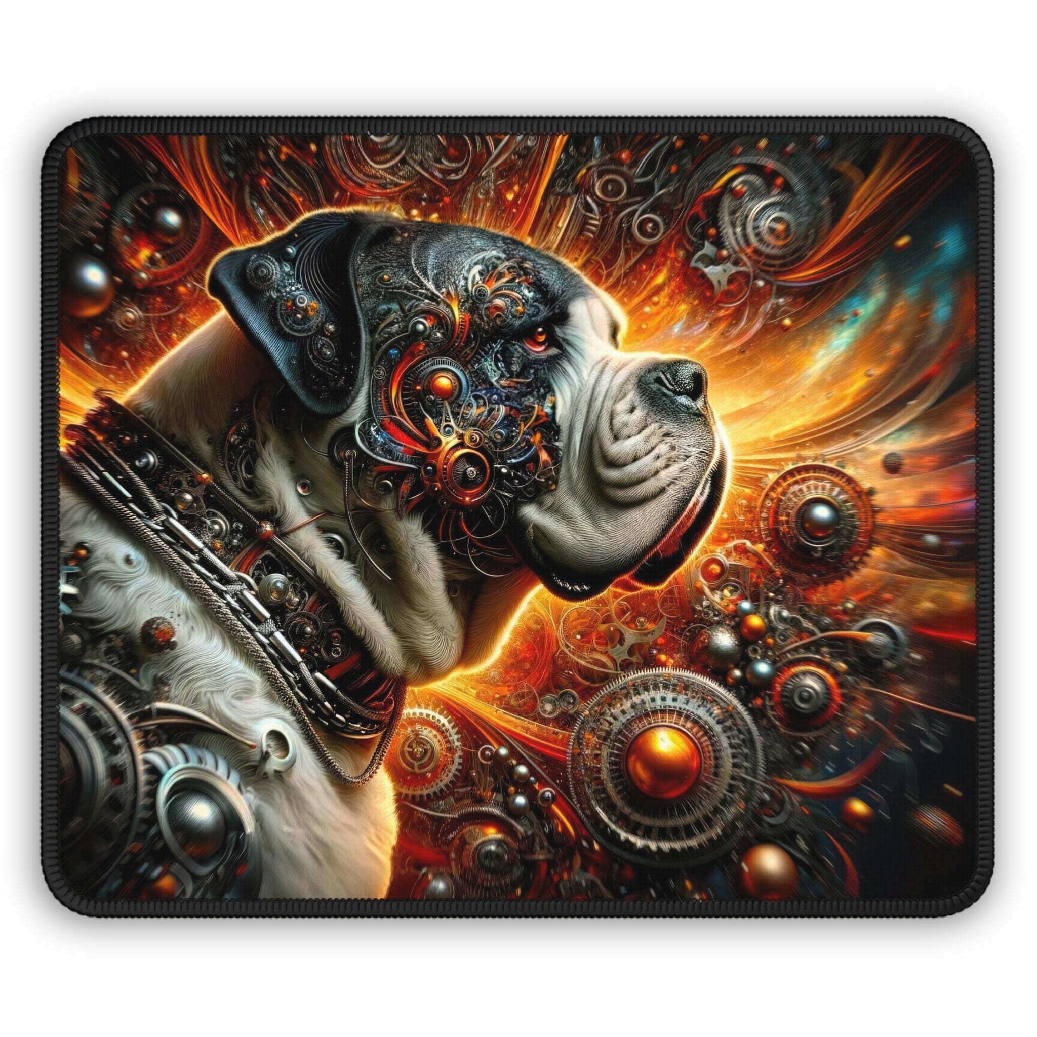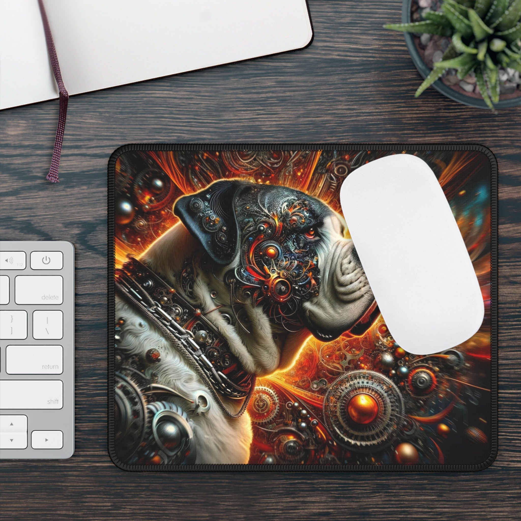 The mouse pad showcases the intricate fusion of the Bullmastiff's stoic charm with the surreal, gear-laden dreamscape that marks the "Fusion of Fur and Circuits." It's a piece of art that doesn't just lie idly; it actively supports your daily endeavors, inspires your imagination, and ignites conversations.