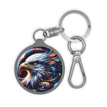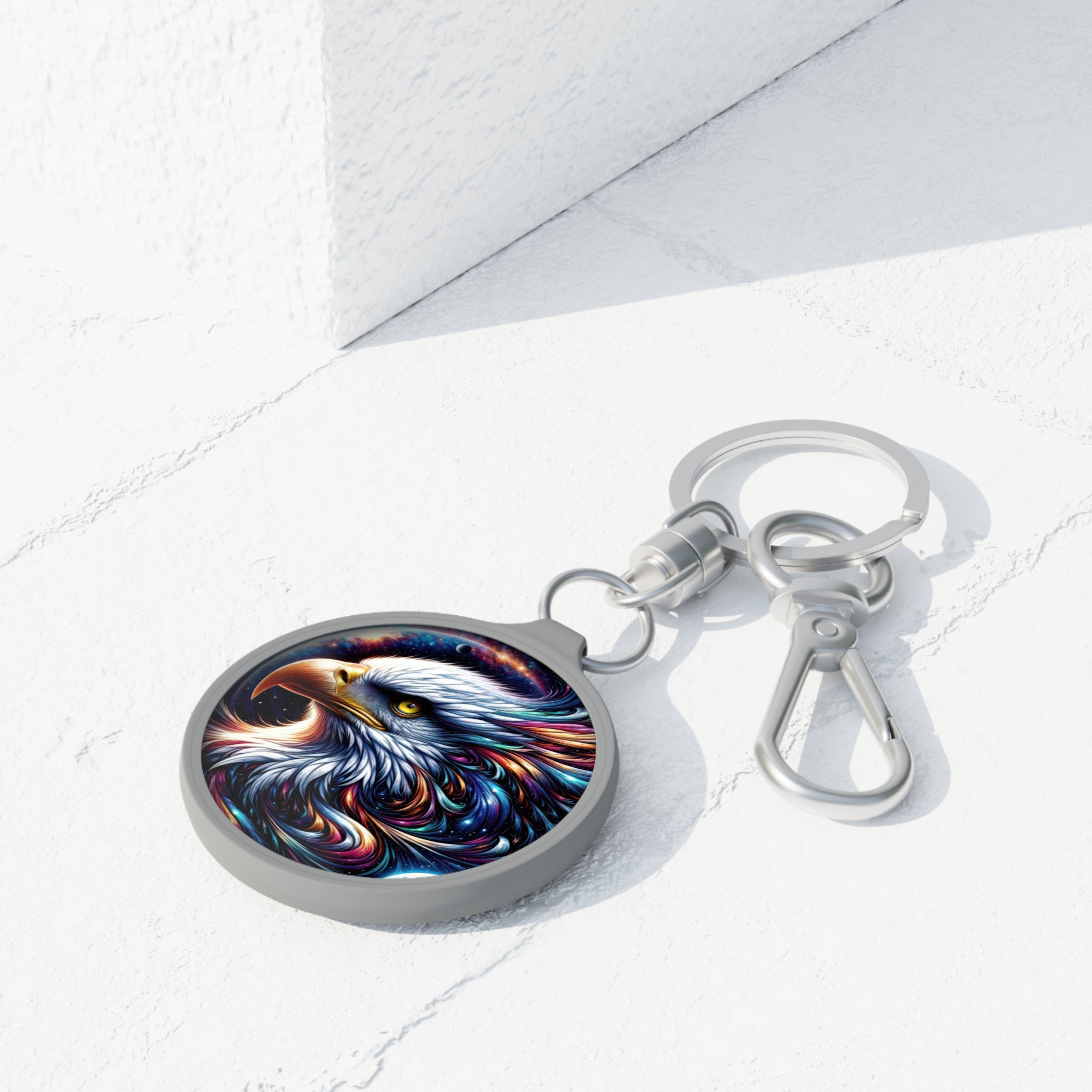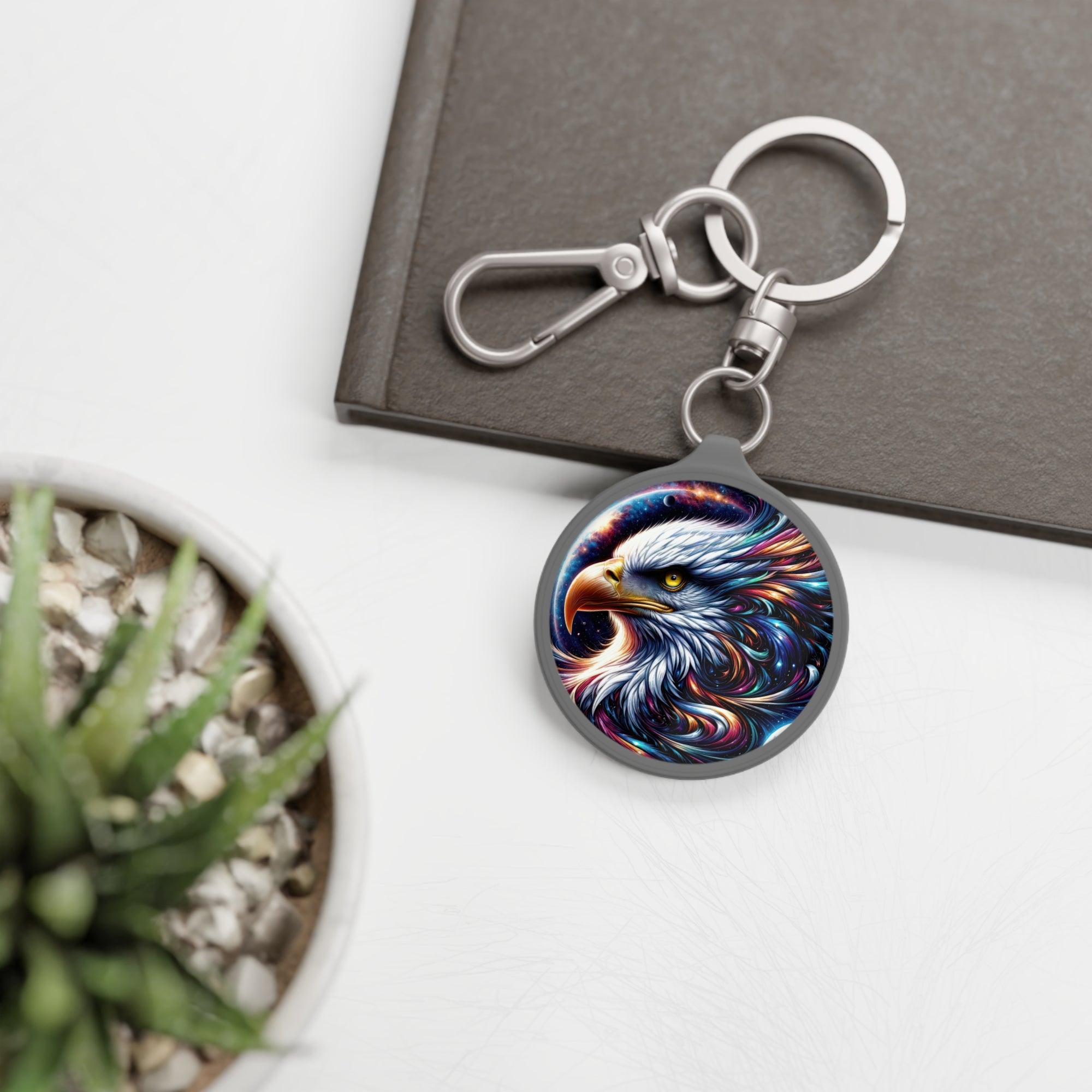 Unlock the mysteries of the cosmos with the 'Galactic Eagle' keyring tag. This stunning accessory brings the majesty of the stars to your pocket, featuring the proud profile of an eagle set against a tapestry of space. Each feather ripples with a cosmic blend of colors, from deep space blues to the vibrant hues of nebulas, and each gaze of the eagle's eye reflects the wisdom of the universe. Planets, stars, and celestial bodies orbit around this noble creature, adding a sense of grandeur and infinity to your daily carry. The artwork is beautifully encased in a crystal-clear, scratch-resistant acrylic, ensuring your piece of the galaxy remains as timeless as the cosmos, with a reliable metal ring to hold your keys.