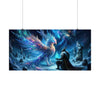 The poster titled "Galactic Frost Sovereign and the Cosmic Phoenix" portrays an otherworldly scene of majestic fantasy. Dominating the landscape is a cosmic phoenix, its feathers a kaleidoscope of starry blues and purples, with hints of vibrant cosmic nebulas woven through them, suggesting a celestial origin. Each plume seems to hold a fragment of the galaxy, shimmering with the light of distant stars. This majestic creature spreads its wings wide, enveloping the scene in an aura of mystic frost.