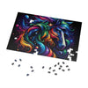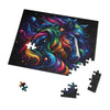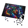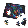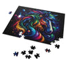 The jigsaw puzzle titled "Galactic Gaze" would feature a mesmerizing image of a horse with its mane and features artistically blending into a vivid cosmic landscape. This puzzle, when completed, would present a striking stallion in profile, with swirls of lustrous, rainbow-colored hair flowing seamlessly into a backdrop of deep space, dotted with stars, planets, and nebulae. Each piece of the puzzle would be a tiny window into both the mystical equine figure and the boundless universe, challenging the assembler to piece together the continuity of flowing lines and the spectrum of colors that range from the warmest reds to the coolest blues. The puzzle would offer not only an engaging activity for individuals and families but also a stunning piece of art once completed. Ideal for puzzle enthusiasts and art lovers alike, "Galactic Gaze" promises to captivate with its blend of natural elegance and otherworldly beauty.