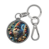 The "Galactic Gnome" keyring tag is an enchanting portrayal of a gnome who seems to be a cosmic wanderer or a celestial Santa, his beard as white as stardust and his eyes twinkling like distant stars. His hat and cloak are a tapestry of the night sky, adorned with bejeweled constellations, nebulas, and celestial bodies that spiral into the infinite. In his hand, he holds a Christmas ornament that mirrors the swirling galaxies, adding a festive touch to the cosmic scene. The backdrop is a fantastical space-scape, with Christmas trees that blend into the fabric of space, decorated with baubles and stars that shine with an otherworldly light. This keyring tag captures the spirit of the holidays while inviting the holder to a universe where fantasy and the cosmic vastness meet in a joyous celebration.