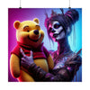 The image presents a stark and fascinating contrast between two characters. On the left, we have the 'Gentle Beast,' depicted as a cheerful, soft, and friendly bear in bright red attire, embodying warmth and innocence with a comforting smile. On the right stands the 'Haunted Queen,' an embodiment of eerie elegance and dark mystery. Her skin is pale, with intricate tattoos or markings, and her face is a haunting mix of skeletal features and captivating beauty. She dons an elaborate headdress, indicating royalty, yet the design leans towards the macabre, enhancing her ghostly allure. The contrast between the characters highlights a thematic dichotomy, possibly exploring the coexistence of light and darkness, innocence and wisdom, or life and death.