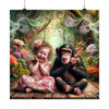 Giggles and Whimsy in Wonderland - This enchanting poster captures a fleeting moment of joy that promises to brighten any space. The laughter of a young girl and her chimpanzee friend resonates through the lush backdrop of a mystical garden, offering a daily reminder of the pure, unbridled joy found in friendship.