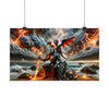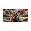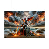 Embrace the epic tale of Sir Caelum, the Storm's Guardian, with our visually stunning poster. This wide-format masterpiece captures the essence of mythical valor, as the knight stands resolute on a tempestuous beach, the sea roaring against the rocks under a menacing sky. The armor of the knight gleams with the strength of fallen stars, reflecting the storm's chaotic light, while his sword, a beacon of fire, pierces the darkness.