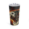 The exterior is adorned with the mesmerizing image of the "Inferno Pup," rendered in exquisite detail against a backdrop of celestial mechanics and fiery hues. The image wraps around the tumbler, offering a 360-degree view of the steampunk-inspired Bullmastiff, its gaze both protective and wise, amidst the swirl of cosmic gears and flames.