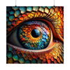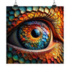 The poster of "Iridescence Intertwined" showcases a stunning close-up of a hyper-realistic eye, with an array of vibrant colors and intricate details that capture the viewer's attention. The iris is a kaleidoscope of fiery oranges, rich reds, and lush greens, resembling the natural beauty of a sunset landscape overlaid by a pattern of honeycomb-like shapes. These geometric forms add a surreal touch to the image, suggesting a fusion of organic beauty with digital artistry. The eyelashes are rendered with extraordinary detail, each hair fine and distinct, sweeping gracefully around the eye and contributing to the overall dramatic effect. The sclera, or white of the eye, transitions smoothly into the vivid colors, ensuring that the iris remains the focal point. This poster is a testament to the complexity and allure of the human eye, transformed into a fantastical work of art that mesmerizes and invites contemplation.