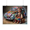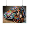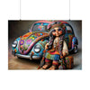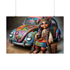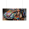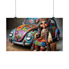 Behind her, a meticulously detailed and color-rich Volkswagen Beetle stands as a symbol of free-spirited adventure, its surface a canvas of hand-painted flowers, peace signs, and psychedelic patterns that embody the flower power movement.